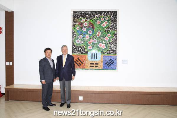 기증작품은 우리나라의 대표적 상징인 태극기와 무궁화, 한반도 지도와 한반도에 사는 사람과 우주 만물을 융합해 대한민국의 번영과 발전을 기원하면서 한지에 먹과 유채로 그린 그림이다.