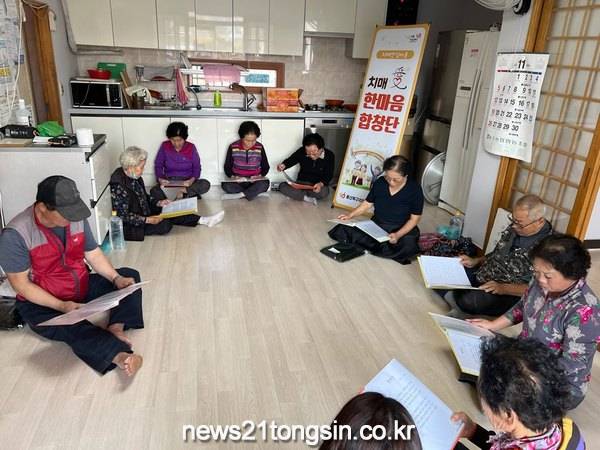 '치매 愛 한마음 합창단'은 신기마을과 이웃마을인 농소1동 차일마을 어르신, 지역주민 40여 명이 함께 각 경로당에서 주 1회 가곡과 트로트 등의 노래를 배우며 우울감 해소를 통한 인지기능 증진을 도모하는 특화 프로그램이다.