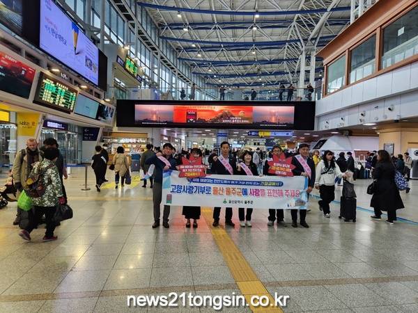 (뉴스21통신/우정석기자) = 울산시 울주군이 6일 KTX서울역에서 이용객을 대상으로 울주군 고향사랑기부제 및 관광명소 홍보에 나섰다.