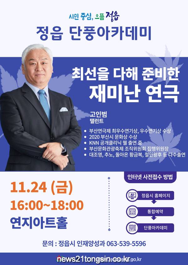 ▲ 정읍시, 24일 탤런트 고인범 초청 제111회 단풍아카데미 개최정읍시는 오는 24일 오후 4시 연지아트홀에서 탤런트 고인범을 초청해 제111회 정읍 단풍아카데미를 개최한다.