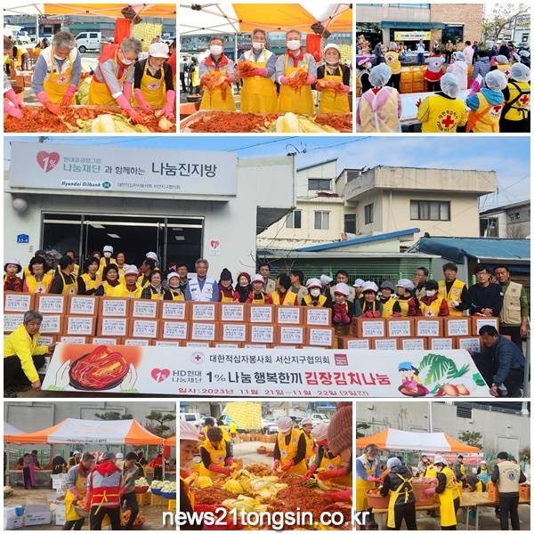 ▲ 충남적십자사 서산지구협의회 김장봉사대한 적십자 봉사회 서산지구 협의회(회장 김인숙)는 22일 진지방에서 '사랑의 김장나눔 행사를 실시했다. 사랑의나눔 봉사에는 충남적십자사 황종헌 부회장과 서산지구 협의회회원 충서라이온스(회장 이선호)회원등 약 80여명이 참여했다. 이날 만들어진 김장나눔은 15개 읍면동 독거노인과 취약계층 가정에 전달하며 서산지구 협의회 정영숙회장은 소외계층관심과 사랑의나눔을 할것을 결의했다.