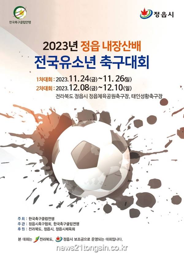 한국축구클럽연맹이 주최하고 정읍시축구협회가 주관해 열리는 이번 대회는 1차 대회 오는 24일부터 26일, 2차 대회 12월 8일부터 10일까지의 일정으로 정읍체육공원 축구장과 태인성황축구장에서 열린다.