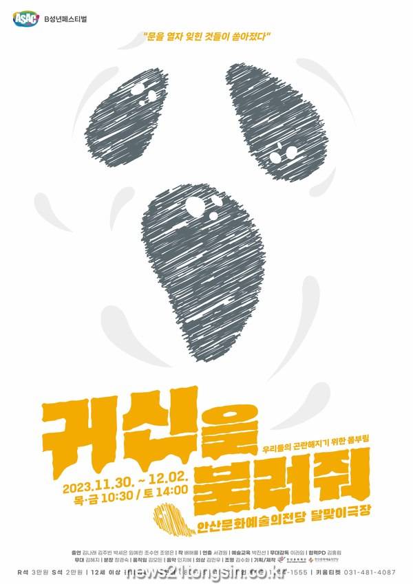 청소년극 귀신을 불러줘의 적정 관람 연령은 만 11세부터다. 11월 30일부터 12월 2일까지 안산문화예술의전당 달맞이극장에서 공연될 예정이다.