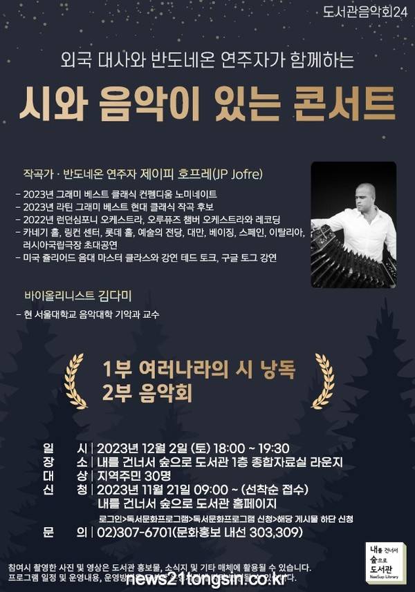 ▲ 사진=은평구청은평구(구청장 김미경)는 오는 12월 2일 오후 6시에 내를건너서숲으로도서관에서 ‘시와 음악이 있는 콘서트’를 개최한다고 밝혔다.