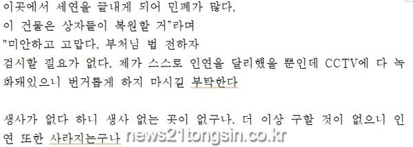 ▲  사진=뉴스21강력한 리더십을 발휘하던 스님의 갑작스러운 죽음으로 조계종 내 권력 구도가 재편될 가능성도 배제할 수 없는 형국이다. 당장 동국대에 강력한 영향력을 미치는 건학위원회, 봉은사 회주, 상월결사 회주, 은정재단 등이 리더십 부재로 표류할 가능성이 있다. 다만 조계종 총무원장을 중심으로 종단이 일치단결해 이번 일을 원활히 수습할 수 있을 것이라는 예측도 나온다.