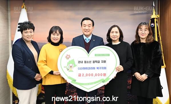 (뉴스21통신/권혁진기자) = (사)아이코리아 울산북구지회는 5일 북구청을 찾아 무룡고등학교 재학생을 위한 장학금 200만원을 전달했다.