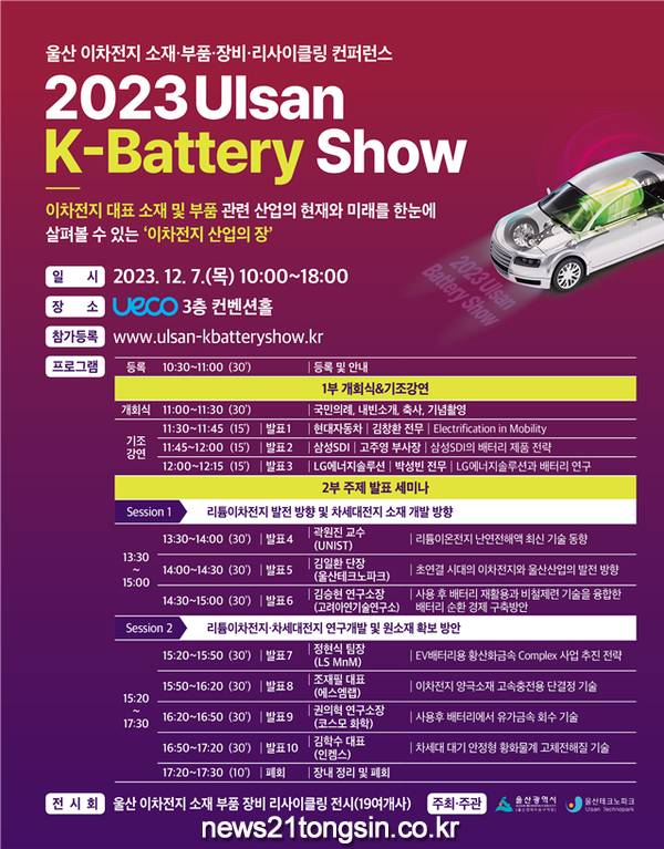(뉴스21통신/우정석기자) = 울산경제자유구역청은 12월 7일 오전 11시 울산전시컨벤션센터(UECO) 컨벤션홀에서 이차전지의 모든 정보를 볼 수 있는 ‘2023 울산 케이-배터리 쇼(Ulsan K-battery Show)’를 개최한다고 밝혔다.