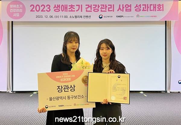 (뉴스21통신/임정훈기자) = 울산광역시 동구보건소가 12월 6일 오전 11시 보건복지부 주최로 서울시 강남구 소노펠리체컨벤션센터에서 열린 ‘2023년 생애초기 건강관리사업 성과대회 개최’에서 초기 사업 선도 운영 지자체로 선정되어 보건복지부 장관상을 수상하였다.