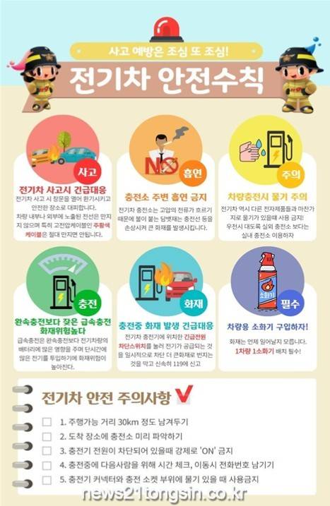 정읍소방서에서 당부하는 전기차 안전수칙은 ▲전기차 사고시 긴급대응 ▲충전소 주변 흡연 금지 ▲차량충전시 물기 주의 ▲차량용 소화기 구입하자 등이다.