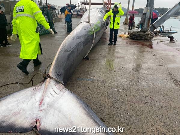 (뉴스21통신/우정석기자) = 울산해양경찰서는 14일 오전11시46분경 부산 기장군 동백항 인근 해상에서 양식장 그물에 참고래 1 마리가 혼획 되었다고 밝혔다.