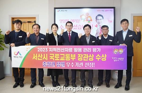 ▲ 이완섭 서산시장이 관련 공무원들과 함께 국토교통부 장관상 수상을 기념하는 모습충남 서산시는 국토교통부 주관으로 실시한 ‘2023년도 지적전산자료 활용 관리 평가’에서 충청권 지자체 중 유일하게 우수기관으로 선정돼 국토교통부장관상을 받는다고 밝혔다.