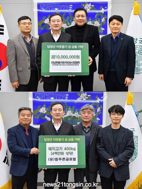 ▲ 사진=담양군청담양군(군수 이병노)은 전남화물자동차운송사업연합회공제조합(이사장 송경태)과 농업회사법인 (유)참푸른글로벌(대표 송석찬)에서 담양군의 어려운 이웃들을 위해 써달라며 이웃돕기 성금 1천만 원과 400만 원 상당의 돼지고기 400kg을 각각 기탁했다고 전했다.