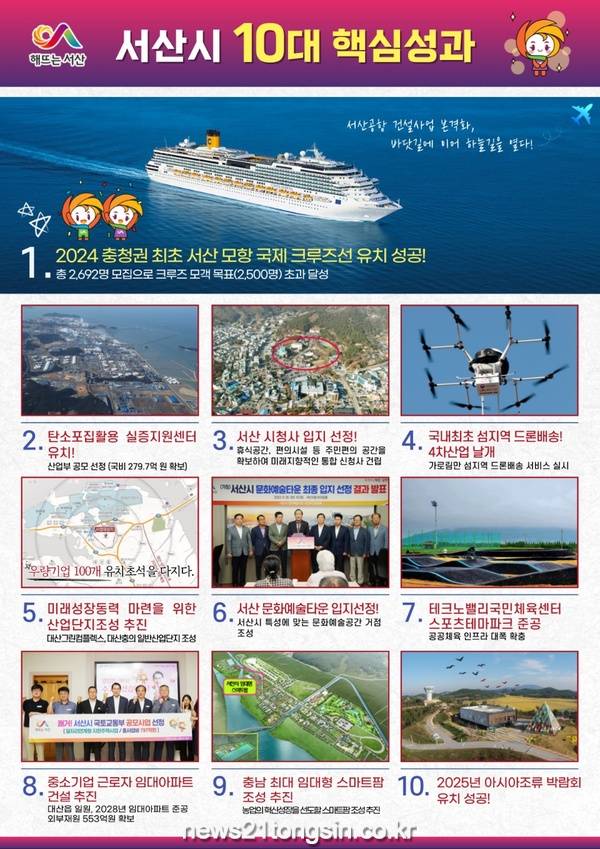 시가 선정한 10대 성과는 국제크루즈선 유치 및 서산공항 건설 본격화 시청사 입지 선정 대산 그린컴플렉스 일반산단 및 대산충의 일반산단 승인 일자리 연계형 지원주택 공모 선정 2025 아시아 조류박람회(ABF) 유치 등이다