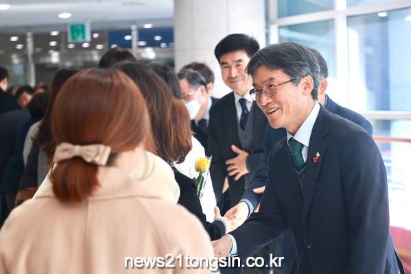 이어 천 교육감과 간부 공무원들은 대강당 입구에서 직원들과 인사하며 덕담을 나눴다.