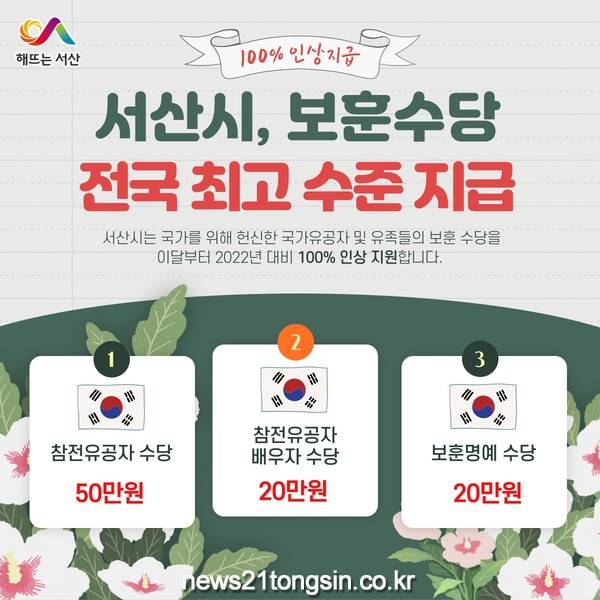 ▲ 서산시 보훈수당 인상 홍보물충남 서산시가 국가유공자와 그 유족에 최선으로 예우한다.