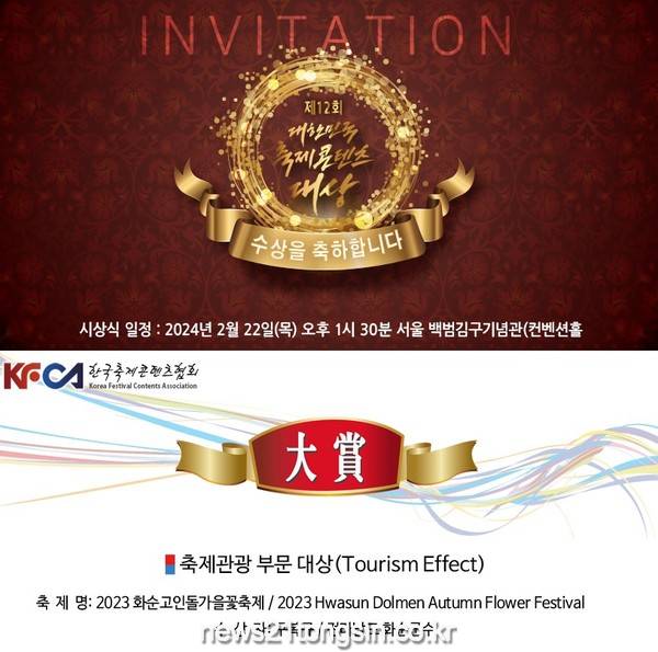 [뉴스21통신 박찬웅 기자] 화순군(군수 구복규)이 (사)한국축제콘텐츠협회가 주최하는 제12회 대한민국축제콘텐츠대상에서 축제 관광 부문 대상 수상의 쾌거를 달성했다.