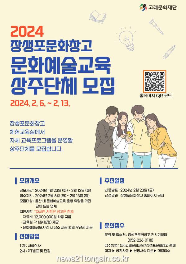 (뉴스21통신/최원영기자)=(재)고래문화재단(이사장 서동욱)은 장생포문화창고에서 2024년 문화예술 프로그램을 운영할 상주단체를 2월6일부터 13일까지 모집한다고 밝혔다.