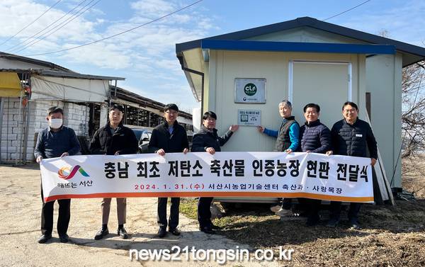 ▲ 31일 사랑목장에서 열린 저탄소 축산물 인증농가 현판 전달식충남 서산시가 31일 관내 한우농가와 홍성 한우농가가 충남에서 최초로 저탄소 축산물 인증농가로 선정됐다고 밝혔다.