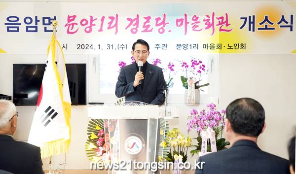 ▲ 31일 음암면 문양1리에서 열린 경로당 개소식 축사를 하는 이완섭 서산시장.이완섭 서산시장은 “신축 경로당이 마을 어르신들과 주민들의 쾌적하고 새로운 복지 공간으로 적극 활용되기를 바란다”며 “앞으로도 관내 어르신들이 좋은 생활환경에서 편안하고 행복한 노후생활을 보낼 수 있도록 최선을 다하겠다”고 말했다.