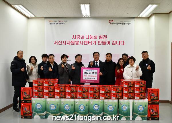 ▲ 서푸른실천연대 이웃을 위한 명절 나눔 활발히 전개 서푸른실천연대(회장 신현용)는 26일 명절을 앞두고 이웃사랑 실천으로 100만원 상당의 생필품(화장지·라면)을 (사)서산시자원봉사센터(센터장 이경구)에 전달했다.