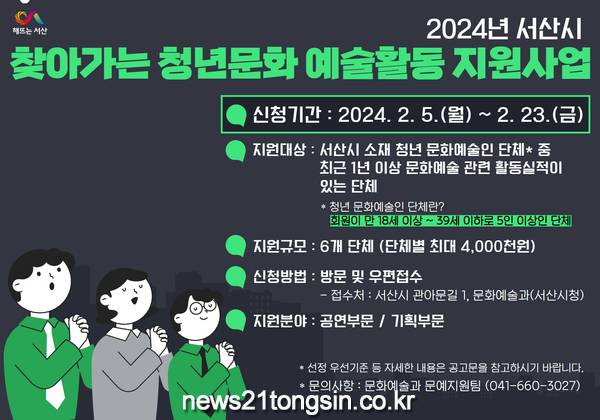 한편 신청 서식 및 지원 기준 등 기타 자세한 내용은 각 읍면동 행정복지센터나 문화예술과 문예지원팀(☎041-660-3027)으로 문의하면 된다.