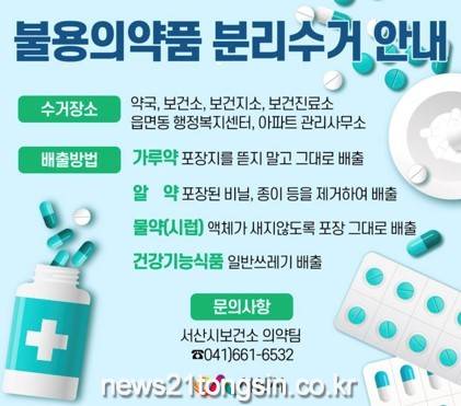 서산시 김용미 보건소장은 “불용의약품이 일반쓰레기나 하수구를 통해 버려질 경우 토양과 수질을 오염시키고 오래된 의약품의 오‧남용은 우리의 건강도 위협할 수 있다”며 “시민들이 올바른 불용의약품 분리배출 방법을 인식하고 실천할 수 있도록 홍보를 강화해 나가겠다”고 말했다.