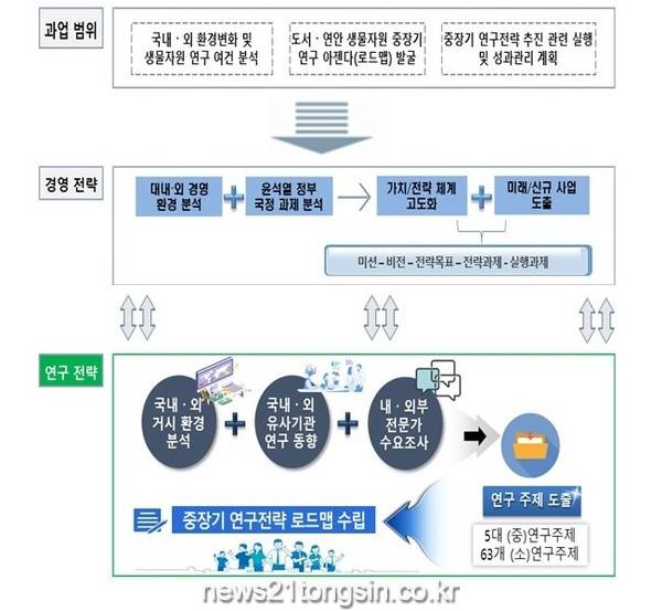 중장기 연구전략의 주요 내용으로는 국내외 환경변화 및 생물자원 연구 여건 분석, 도서·연안 생물자원 중장기 연구 아젠다 발굴, 중장기 연구전략 추진 실행 및 성과관리 계획 등이 포함되어 있다.