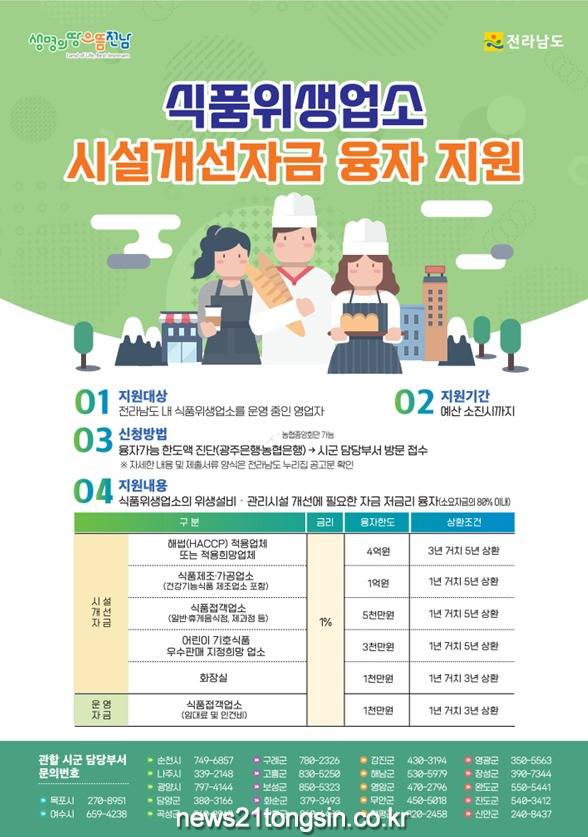 [뉴스21통신 박찬웅기자] 전라남도는 안전한 외식환경을 구축하기 위해 위생등급제 지정업소 중 도내 일반음식점, 휴게음식점, 제과점을 대상으로 800개소를 선정, 환경개선비를 지원한다고 밝혔다.