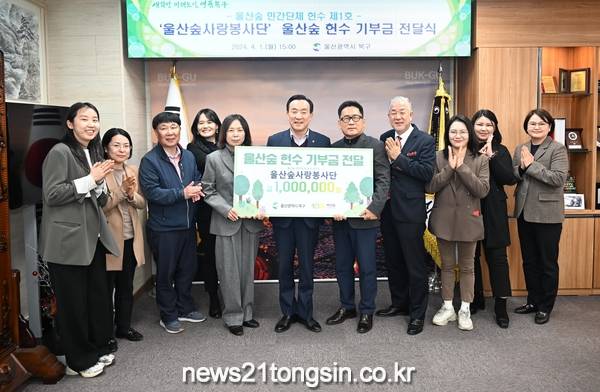 북구는 이날 구청장실에서 울산숲 민간단체 제1호 헌수 기부금 전달식을 열고, 울산숲 헌수에 동참한 울산숲사랑봉사단에 감사의 뜻을 전했다.