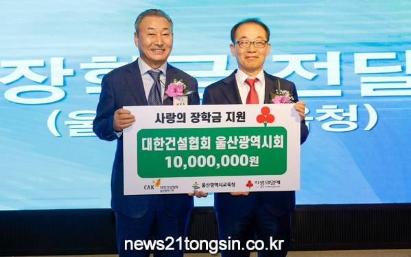 (뉴스21통신/우정석기자) = 대한건설협회 울산광역시회(회장 장홍수)가 24일 울산광역시교육청(교육감 천창수)에 장학금 1,000만 원을 전달했다.