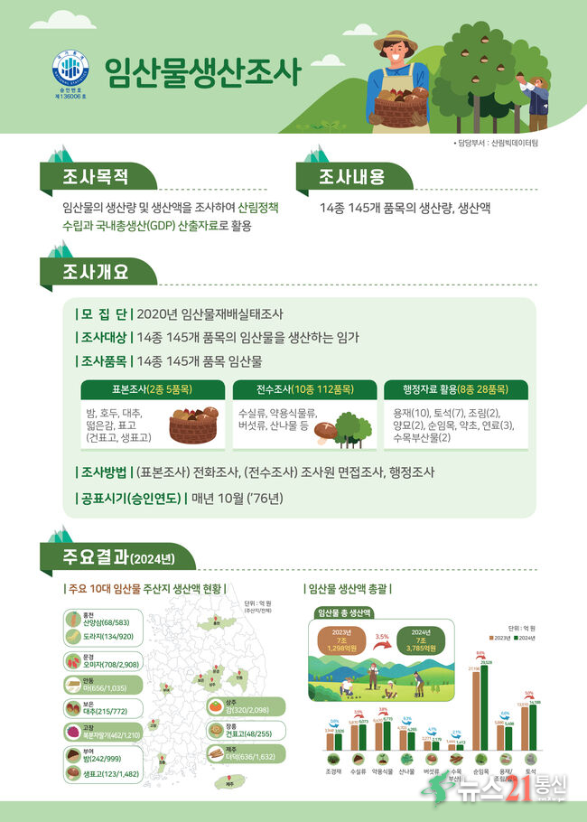 지난해 임산물 생산액 7조 4천억원... 전년 대비 3.5% 증가- 경상북도가 1조 3,866억 원으로 전년에 이어 가장 높아산림청(청장 김인호)은 ‘2024년 임산물생산조사’ 결과 총임산물 생산액은 전년(2023년 7조 1,298억 원)보다 2,487억 원 증가한 7조 3,785억 원으로 조사됐다고 31일 밝혔다. ‘임산물생산조사’는 1976년 국가승인통계(제136006.