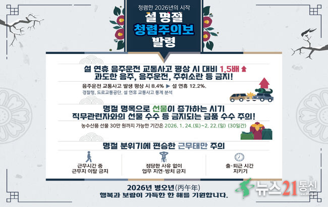태백시(시장 이상호)는 설 명절을 앞두고 오는 2월 4일부터 2월 23일까지 20일간 전 직원을 대상으로 ‘청렴주의보’를 발령하고 공직기강 확립에 나선다고 밝혔다.‘청렴주의보’는 명절과 연말연시 등 부패 위험이 높아지는 시기에 발생할 수 있는 청렴 저해 요인을 사전에 안내하고, 행동강령 위반을 예방하기 위한 공직사회 ..