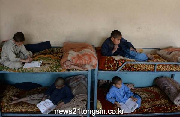 아프가니스탄 고아원에서 전쟁 중 부모를 잃은 아이들이 자신의 침대에 앉아 책을 읽고 있다.