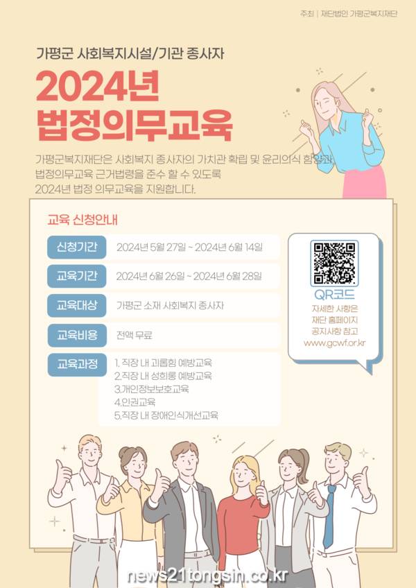 가평군복지재단은 사회복지 종사자를 대상으로 법정의무교육을 오는 6월 26일부터 28일까지 청평도서관 어울림실에서 실시한다고 밝혔다.