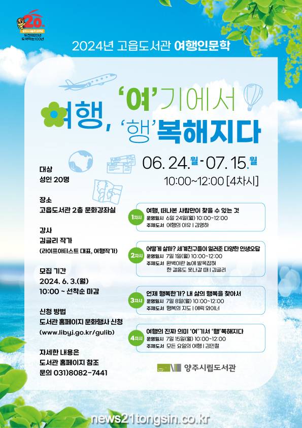 양주시(시장 강수현)가 올 6월 관내 고읍도서관에서 매 차시 주제와 연결된 여행책을 읽고 여행을 통해 내 삶을 돌아보며 나아가 진정한 여행의 의미가 무엇인지 깨닫는 여행 인문학 특화프로그램 “여행, ‘여’기에서 ‘행’복해지다”를 운영한다고 밝혔다.
