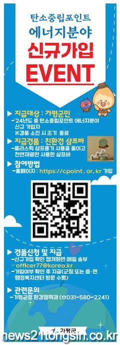 가평군(군수 서태원)은 군민들의 일상 속 탄소중립 실천문화를 확산시키고 탄소중립포인트제 운영 활성화를 위해 ‘탄소중립포인트제 에너지분야’ 신규가입 이벤트를 진행한다고 31일 밝혔다.