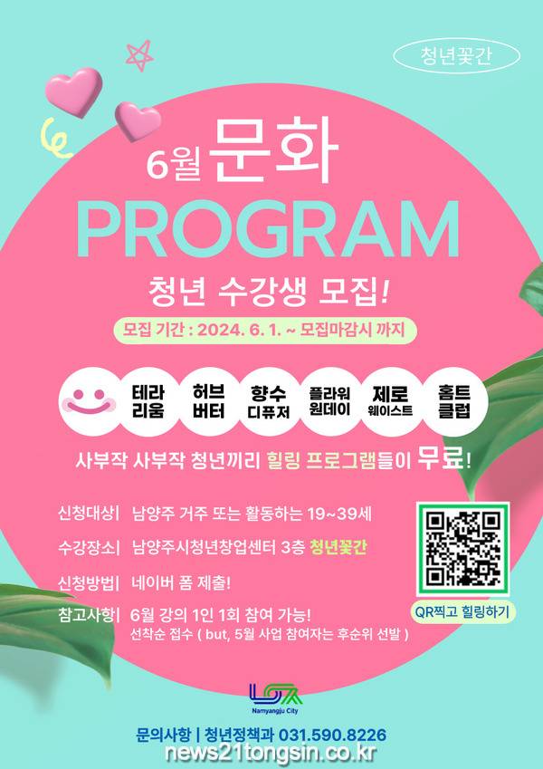 남양주시(시장 주광덕)는 오는 6월 11일부터 남양주청년창업센터(남양주시 늘을2로14번길 12) 내 청년꽃간에서 청년의 다양한 관심사를 반영한 6개 문화프로그램 운영한다고 31일 밝혔다.