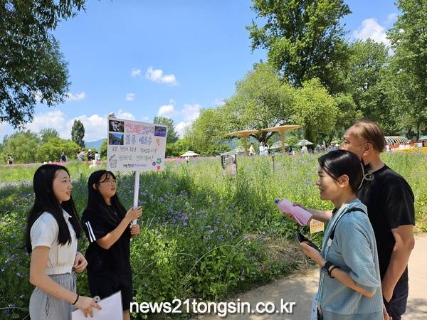 지난 5월 한 달간 꽃 페스타에 식재되는 꽃을 미리 확인하고 알아본 청소년들은 자신이 해설하고자 하는 꽃을 선택해 꽃말, 원산지, 다양한 특징들을 조사하고 원고를 작성했다. 또한, 자신들이 꽃 해설사임을 알리기 위해 피켓을 직접 제작해 토요일인 1일 봉사활동에 나섰다.