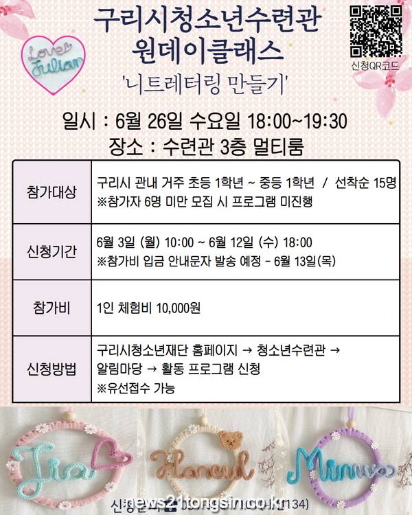 구리시청소년재단(대표이사 강종일) 청소년수련관은 환경보호 활동의 일환으로, 오는 6월 22일 빛소어린이작은도서관과 6월 26일 수련관 3층 멀티룸에서 니트와 실 등을 활용한 ‘니트레터링 만들기’ 프로그램을 운영한다.