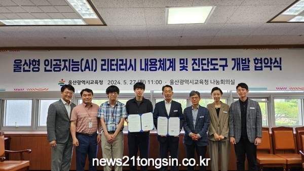 울산교육청은 최근 시교육청 나눔회의실에서 울산과학기술원(UNIST) 인공지능대학원과 ‘울산형 인공지능(AI) 문해력(리터러시) 내용 체계와 진단 도구 개발’을 위한 업무협약을 했다.