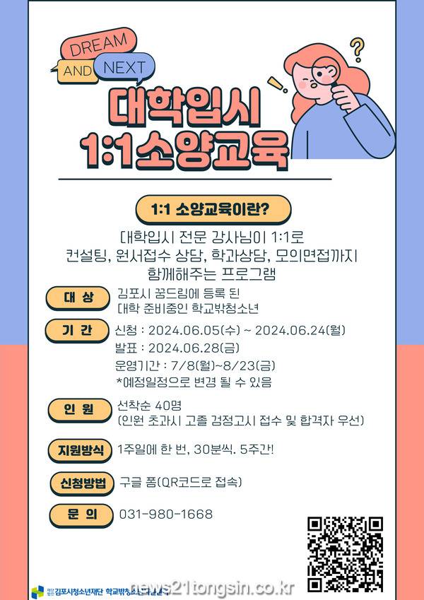 대상자는 김포시 꿈드림에 등록된 대학 준비 중인 학교 밖 청소년이며 모집은 6월 24일까지이다. 참가를 희망하는 경우 QR코드 혹은 링크(https://forms.gle/UNkLLkuFxrhepjCL8)를 통해 신청서를 작성하여 접수할 수 있다.