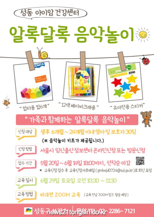 서울 성동구(구청장 정원오)는 오는 29일 생후 6개월~24개월 영유아 양육가정을 대상으로 토요 비대면 음악놀이 교실 특강을 운영한다.