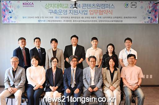 협약식에는 강원문화재단 신현상 대표이사, 상지대학교 산학협력단 김상호 단장, 문화콘텐츠학과 최보연 학과장, 앰버린 배진희 대표이사, 춘천문화재단 공연예술창업지원센터 신미란 센터장, 횡성회다지소리 문화체험관 신동혁 사무국장 등이 참석했다.