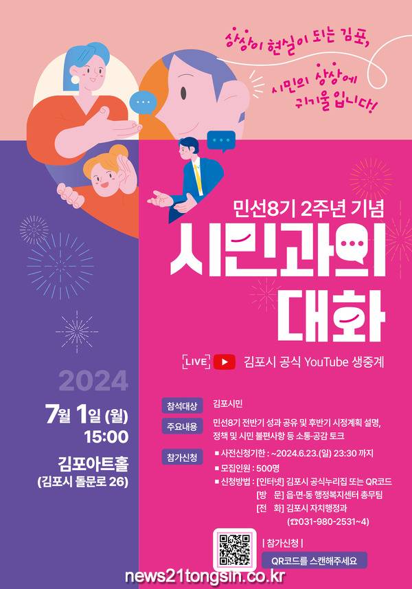시민과의 대화 참가를 희망하는 경우 6월 23일까지 ▲김포시 공식누리집 또는 QR 온라인 접수가 가능하며, 6월 25일까지 ▲읍·면·동 행정복지센터 방문 접수 ▲자치행정과 전화 접수(031-980-2531~4)로 신청이 가능하다.