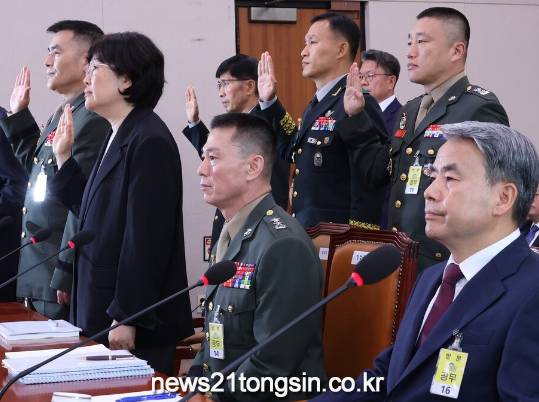 21일  ‘채 상병 특검법’ 입법 청문회에 증인으로 출석한 이종섭 전 국방부 장관, 신범철 전 국방부 차관, 임성근 전 해병대 1사단장이 청문회 증인 선서를 거부했다.