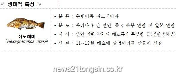 쥐노래미는 우리나라 전 연안에 분포하며 암초나 해조류가 풍성한 곳에 서식하는 연안 정착성 어류로 지역에 따라 돌삼치(강원), 게르치(경남) 등으로 불리며, 소비자와 어업인의 선호도가 높아 고가에 거래되는 어종으로 알려져 있다.