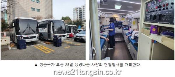 서울 성동구(구청장 정원오)는 오는 25일 오전 10시부터 오후 4시까지 성동광진교육지원청 뒤편 옥외주차장에서 직원 및 지역주민을 대상으로 ‘생명나눔 사랑의 헌혈’ 행사를 진행한다.