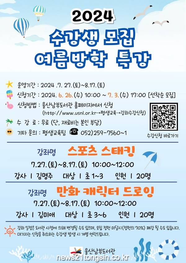 (뉴스21통신/우정석기자) = 울산남부도서관(관장 최형근)은 오는 7월 27일부터 8월 17일까지 매주 토요일마다 초등학생을 대상으로 ‘2024 여름방학 특강’을 운영한다.