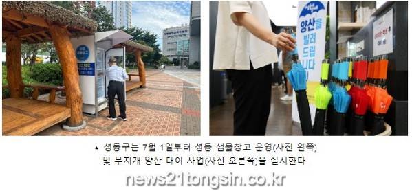 서울 성동구(구청장 정원오)가 여름철 폭염이 본격화됨에 따라 주민들이 온열질환과 탈수 등 폭염 재난으로부터 안전한 여름을 보낼 수 있도록 ‘성동 샘물창고’와 ‘무지개양산’ 대여 사업 운영에 나선다.