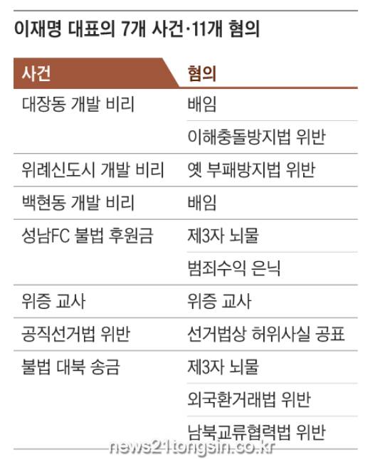 한편, 이 대표는 총 7개 사건의 11개 혐의로 재판을 받게 됐다. 재판이 많을 때는 1주일에 3~4차례 법원에 출석해야 한다. 이 대표는 현재 대장동·백현동·위례신도시 개발 비리를 비롯해, 성남FC 불법 후원금, 위증 교사, 공직선거법상 허위 사실 공표 등 사건으로 기소돼 재판을 받고 있다. 서울중앙지법에서는 대장동·백현동·성남FC 등 관련 배임·뇌물 혐의 사건과 공직선거법 위반, 위증교사 혐의 사건 등 3개 재판을 받고 있다. 대북송금 사건이 서울중앙지법에 병합되지 않으면, 이 대표는 서울중앙지법과 수원지법을 번갈아 출석해야 한다. 중앙지법은 여의도 국회에서 14km 거리이지만, 수원지법은 41km가량 떨어져 있다.